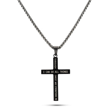 Men’s Stainless Steel Cross Necklace with Lord’s Prayer Engraving – Black or Silver, 26” Chain